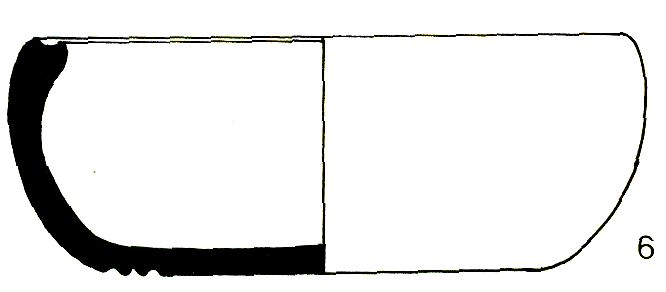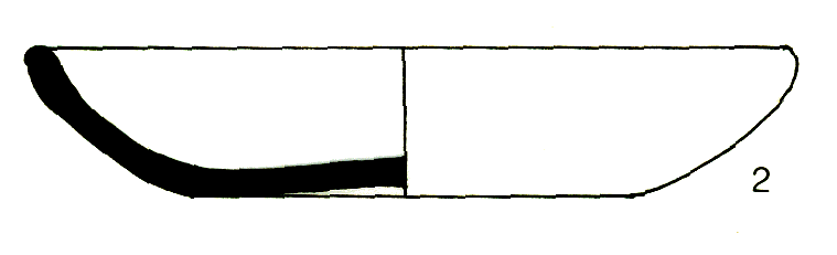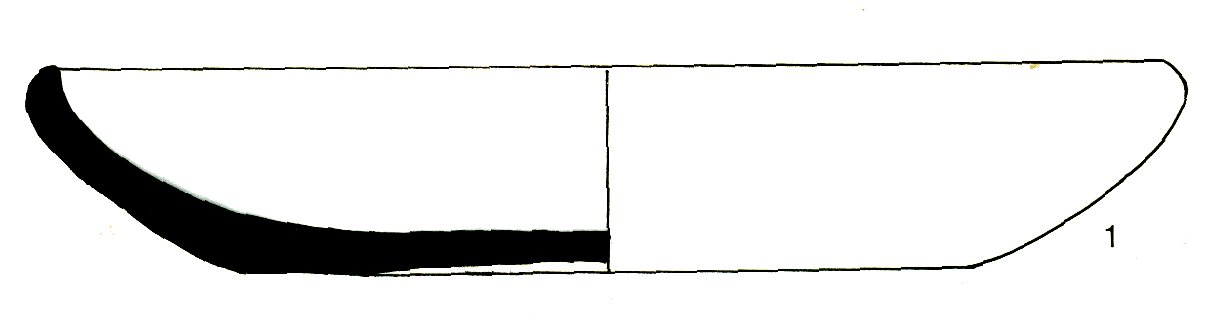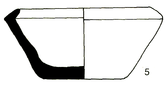 Jatte aux parois divergentes rectilignes ; rebord incliné vers l'intérieur, lèvre triangulaire ; base portante, assise plane ; céramique non tournée, couleur gris-bleu en surface et sur les cassures ; inclusions très grossières: quartz irrégulier abondant, mica ; surface brute.