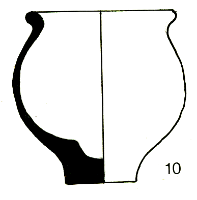 Pot de forme elliptique aplatie ; encolure verticale, concave, rebord épaissi à l'extérieur, lèvre convexe ; base étirée, assise plane ; céramique tournée, pâte de couleur noire, jaunâtre en surface ; inclusions grossières: quartz irrégulier en proportion moyenne, mica ; surface brute.