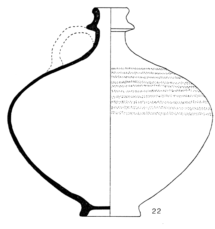 base cylindrique, assise concave ; anse s'attachant sur le haut du col et sur le haut de la panse ;
