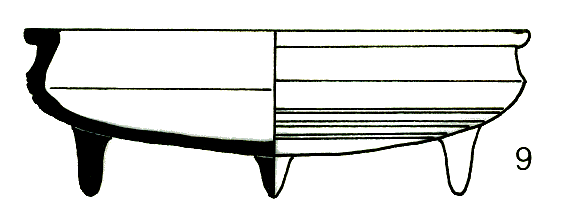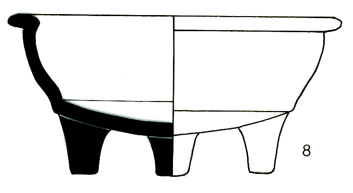 Marmite tripode aux parois divergentes convexes en bas, puis convergentes rectilignes ; rebord en méplat débordant, lèvre plate ; pieds coniques verticaux ;