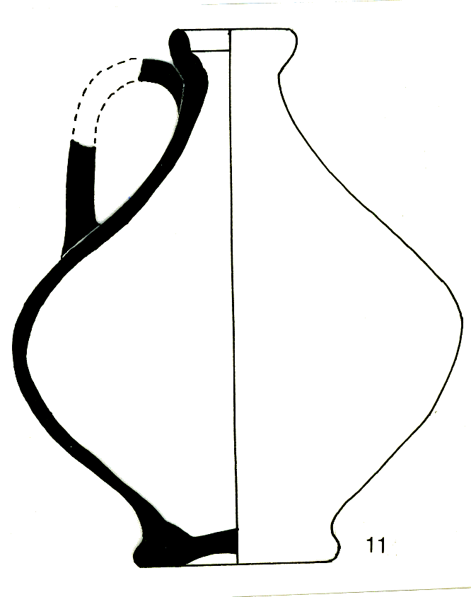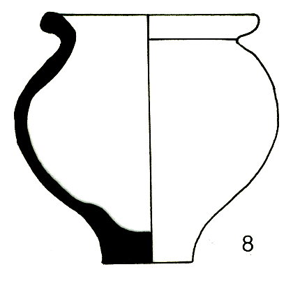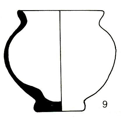 Pot de forme elliptique aplatie ; encolure verticale, concave, rebord épaissi à l'extérieur, lèvre convexe ; base étirée, assise plane ; céramique tournée, pâte de couleur noire, jaunâtre en surface ; inclusions grossières: quartz irrégulier en proportion moyenne, mica ; surface brute.