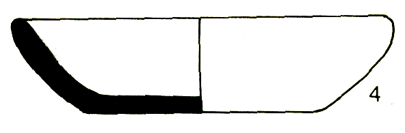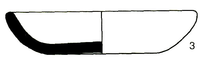 Jatte aux parois divergentes rectilignes ; rebord incliné vers l'intérieur, lèvre triangulaire ; base portante, assise plane ; céramique non tournée, couleur gris-bleu en surface et sur les cassures ; inclusions très grossières: quartz irrégulier abondant, mica ; surface brute.