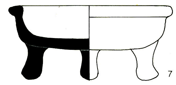 Marmite tripode aux parois divergentes convexes en bas, puis verticales convexes ; rebord en méplat débordant, lèvre convexe ; pieds coniques évasés ; céramique non tournée, couleur gris-bleu en surface et sur les cassures ; inclusions très grossières: quartz irrégulier abondant, mica ; surface brute.