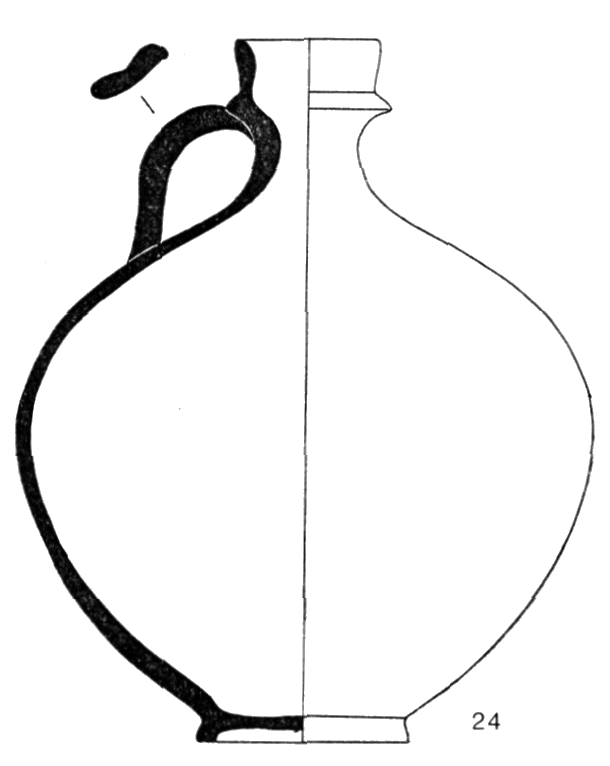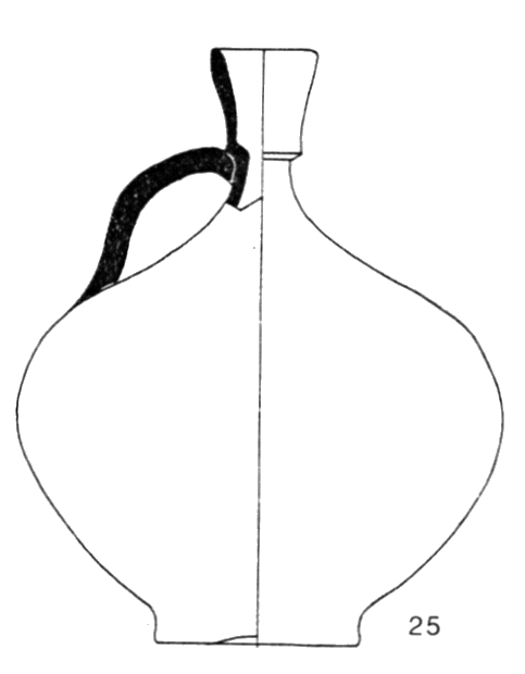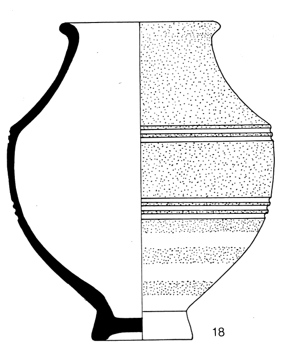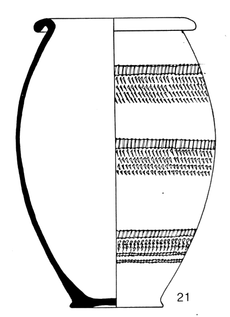 base cylindrique, assise concave ; anse s'attachant sur le haut du col et sur le haut de la panse ;