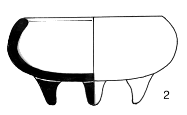 Marmite tripode aux parois divergentes convexes en bas, puis convergentes convexes ; lèvre ronde ;